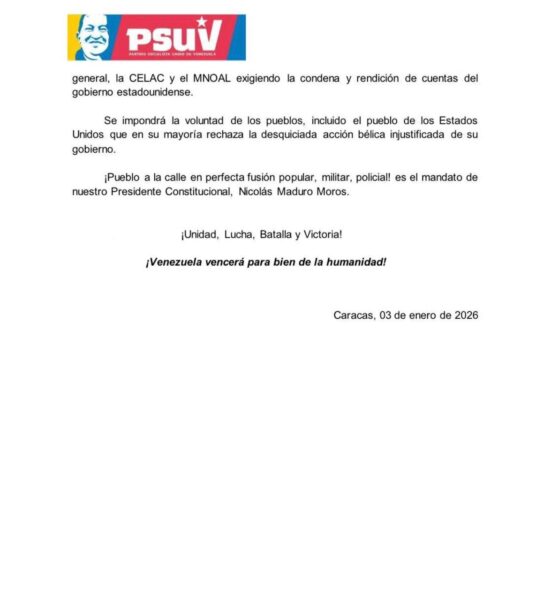 PSUV exige a Estados Unidos que devuelva al Presidente Nicolás Maduro y a la Primera Dama
